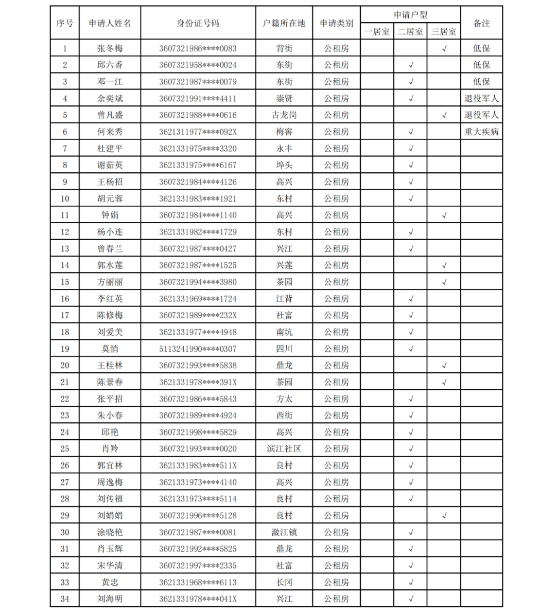 為確保本期公共租賃住房、人才住房實物分配公開、公平、公正,接受社會及群眾監督,現將截止至2023年10月25日18時提交申請的106戶公共租賃住房申租家庭、85戶人才住房申租家庭、33戶公共租賃住房輪候家庭進行公示:
