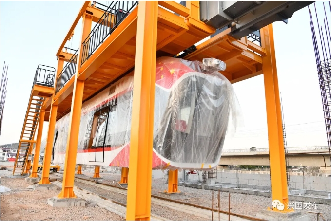 ▲國內首個磁懸浮空軌列車“興國號”成功掛線