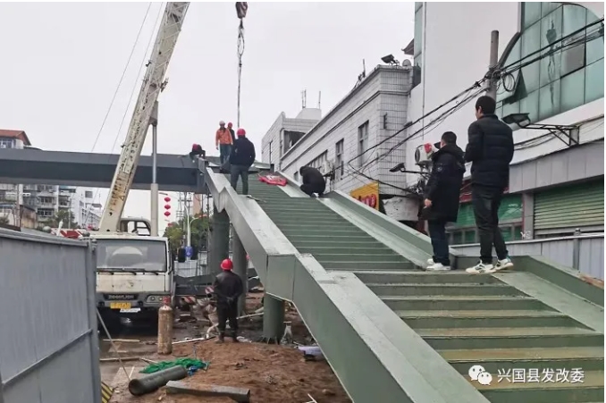 五中人行天橋已完成橋面吊裝,已完成樓梯樁基施工,正在進行上橋樓梯安裝。建成后可有效緩解交通壓力,提高通行效率,提升城區(qū)整體形象,減少安全隱患。