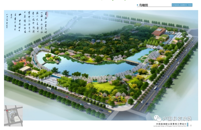 興國縣和睦公園,四面由城市道路圍合,北臨平陽路,南至模范大道,西接和睦大道,東傍富平路,占地約114畝。該項(xiàng)目建成后涵蓋水體景觀、城市規(guī)劃展覽館、游步道、景觀綠化、園林小品等內(nèi)容,通過文化元素的滲透,山水關(guān)系的梳理,功能空間的布局,活動場地的構(gòu)建,自然環(huán)境的美化,現(xiàn)代江南的演繹,塑造集“文化展示、生活休閑、健康運(yùn)動、生態(tài)科普”于一體的中心公園。