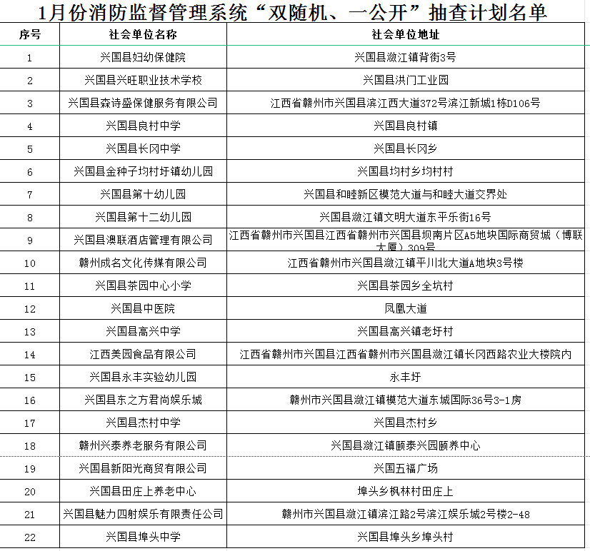 為深入推進全市火災防控工作,進一步預防和減少火災危害,保障公共安全,督促各單位、各場所盡職盡責,根據《中華人民共和國消防法》、《消防監督檢查規定》等有關法律法規要求,興國縣消防救援大隊將依法開展“雙隨機、一公開”消防監督抽查,特制定抽查計劃并公告如下: