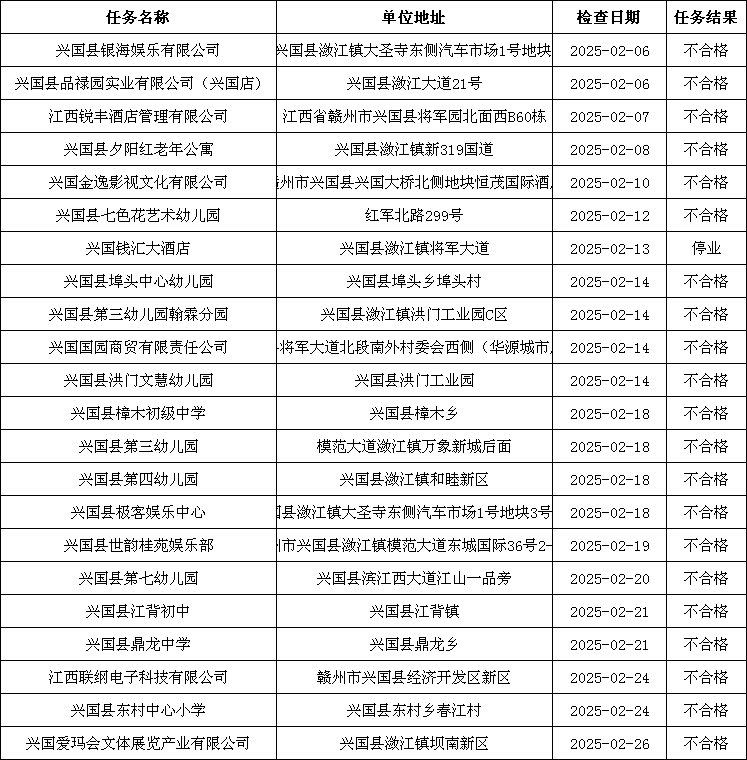 2025年2月份江西省“雙隨機、一公開”消防監管信息系統抽中單位檢查結果公示