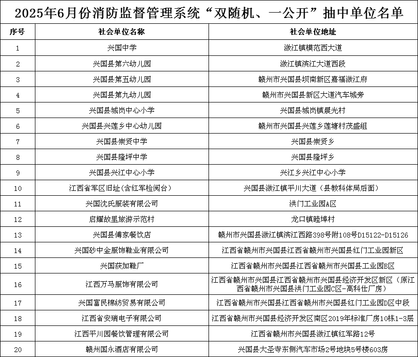 附件為6月份“雙隨機、一公開”消防監督抽查系統隨機生成本月檢查的單位,共20家。