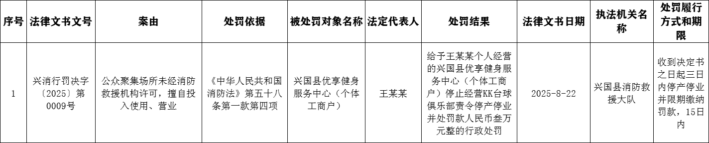 2025年8月消防行政處罰信息公開