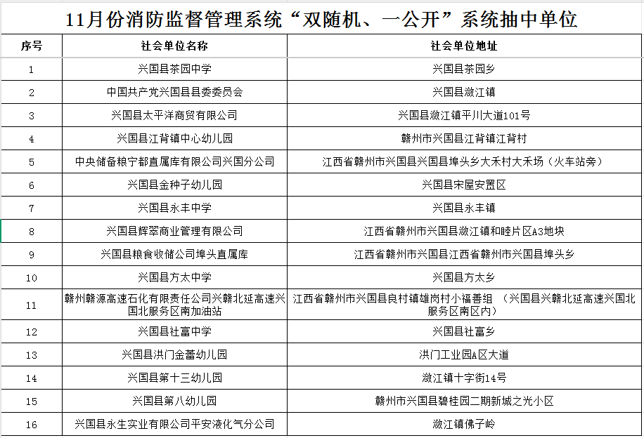 附件為11月份“雙隨機、一公開”消防監督抽查系統隨機生成本月檢查的單位,共16家。