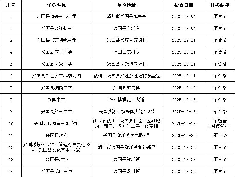 2025年12月份江西省“雙隨機、一公開”消防監(jiān)管信息系統(tǒng)抽中單位檢查結果公示