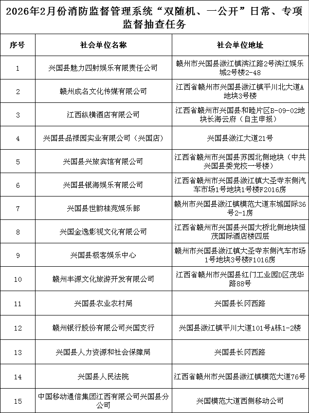為深入推進(jìn)全市火災(zāi)防控工作,進(jìn)一步預(yù)防和減少火災(zāi)危害,保障公共安全,督促各單位、各場(chǎng)所盡職盡責(zé),根據(jù)《中華人民共和國(guó)消防法》、《消防監(jiān)督檢查規(guī)定》等有關(guān)法律法規(guī)要求,興國(guó)縣消防救援大隊(duì)將依法開展“雙隨機(jī)、一公開”消防監(jiān)督抽查,特制定抽查計(jì)劃并公告如下:
