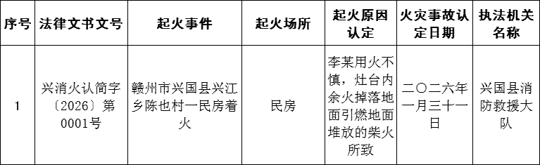 2026年1月份火災(zāi)事故認(rèn)定信息公開(kāi)