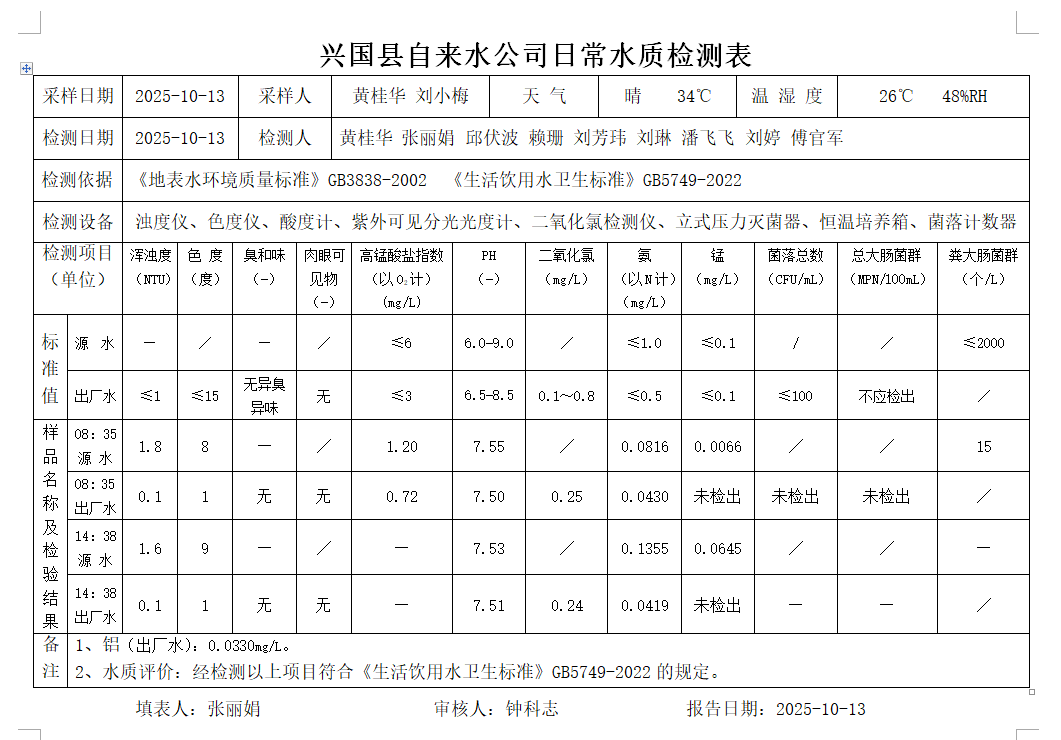 水質(zhì)常規(guī)檢測臺賬(2025年10月13日)