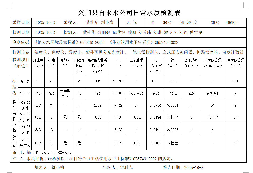水質(zhì)常規(guī)檢測(cè)臺(tái)賬(2025年10月8日)