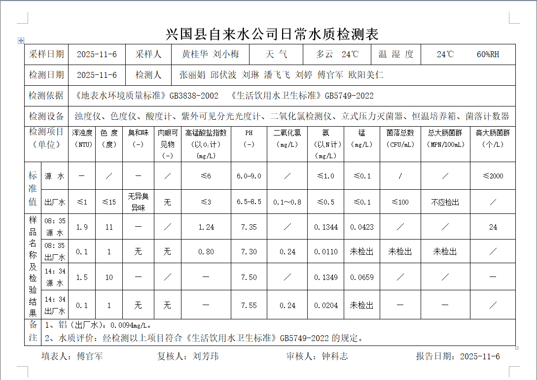 水質(zhì)常規(guī)檢測臺(tái)賬(2025年11月6日)