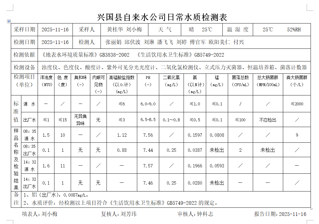 水質(zhì)常規(guī)檢測臺賬(2025年11月16日)