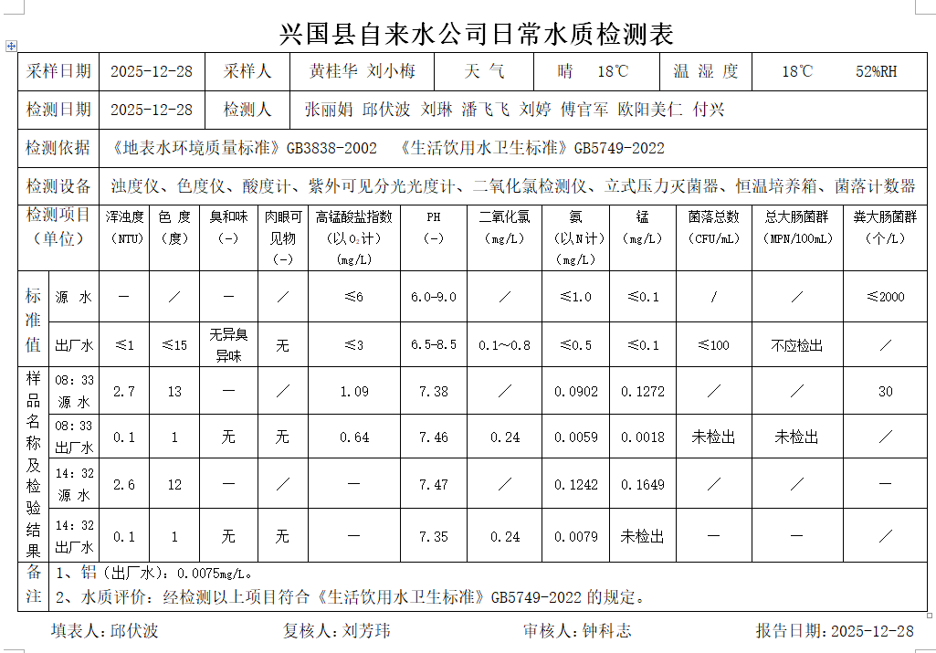 水質(zhì)常規(guī)檢測(cè)臺(tái)賬(2025年12月28日)