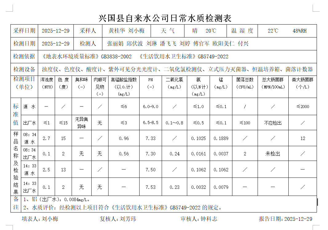 水質(zhì)常規(guī)檢測(cè)臺(tái)賬(2025年12月29日)