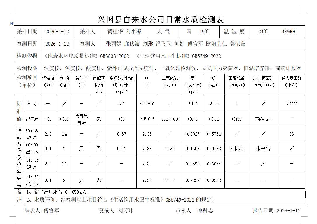 水質(zhì)常規(guī)檢測臺賬(2026年1月12日)