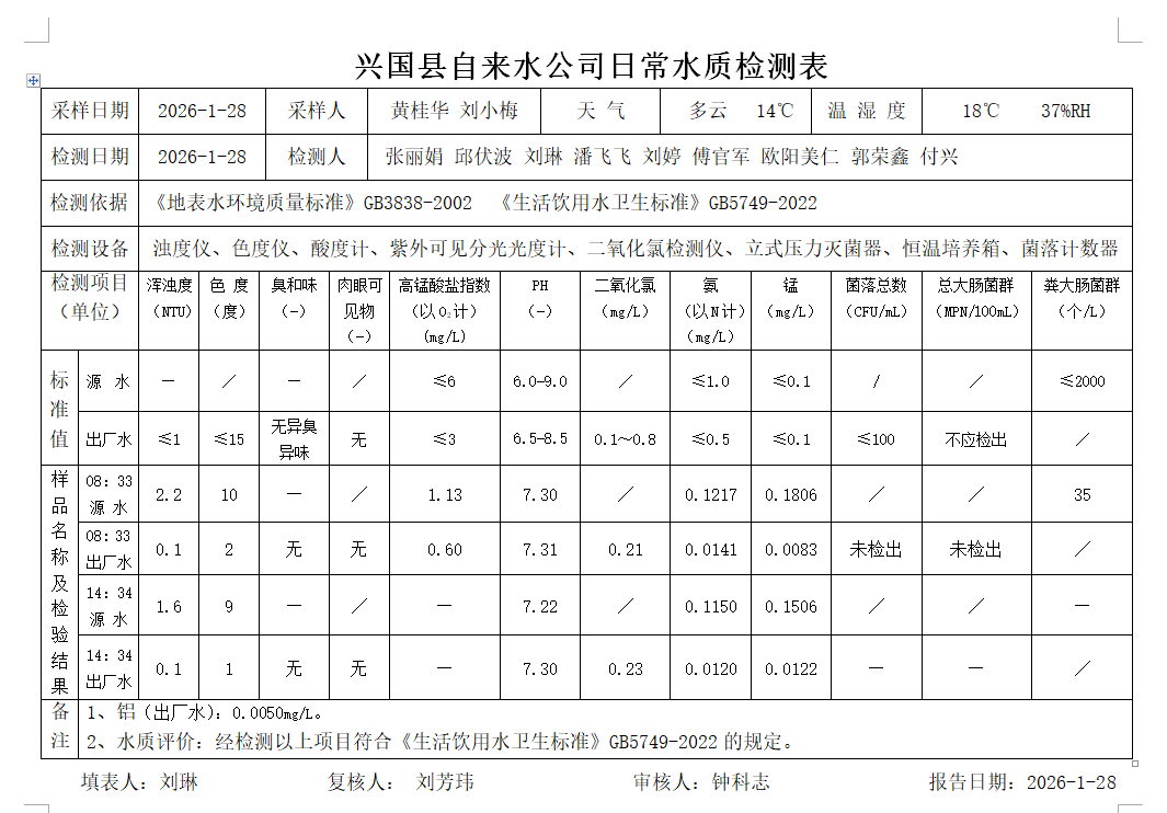 水質(zhì)常規(guī)檢測(cè)臺(tái)賬(2026年1月28日)