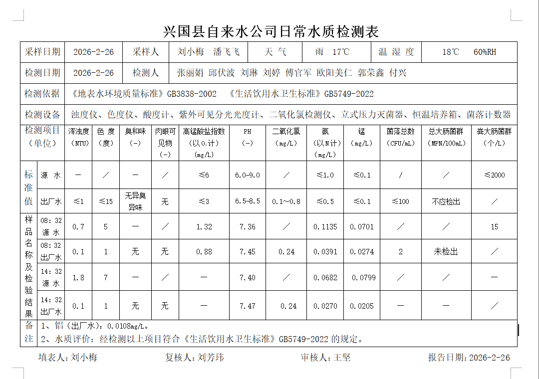 水質常規檢測臺賬(2026年2月26日)