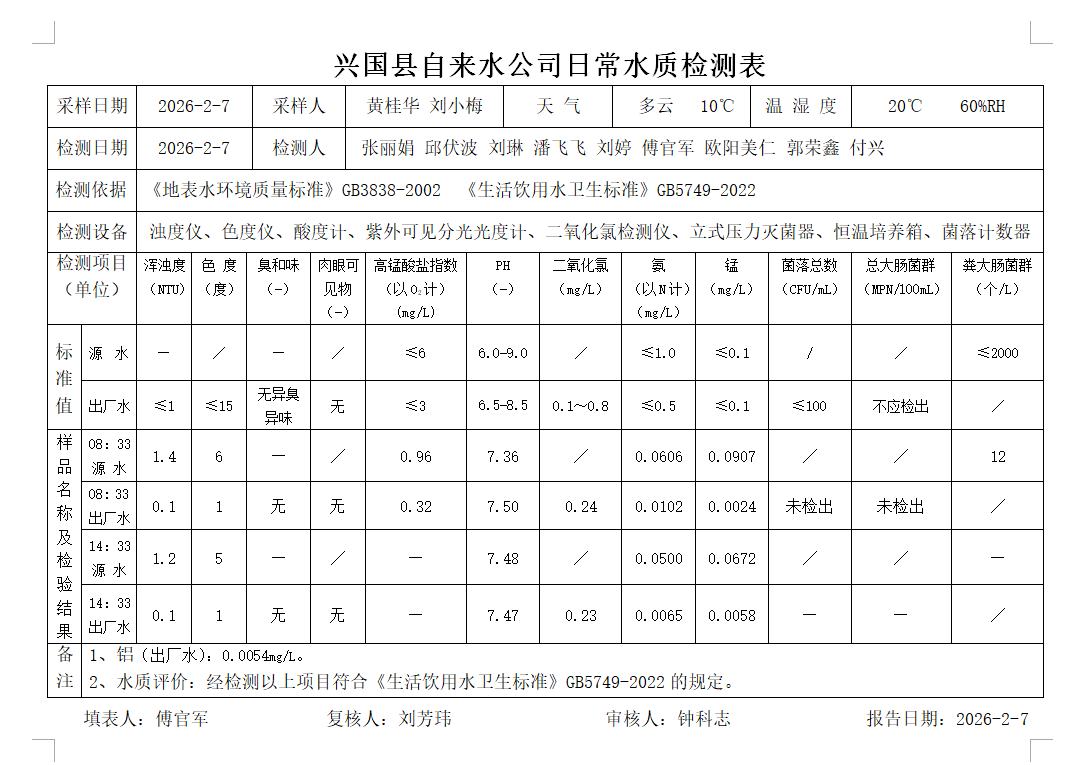水質常規檢測臺賬(2026年2月7日)
