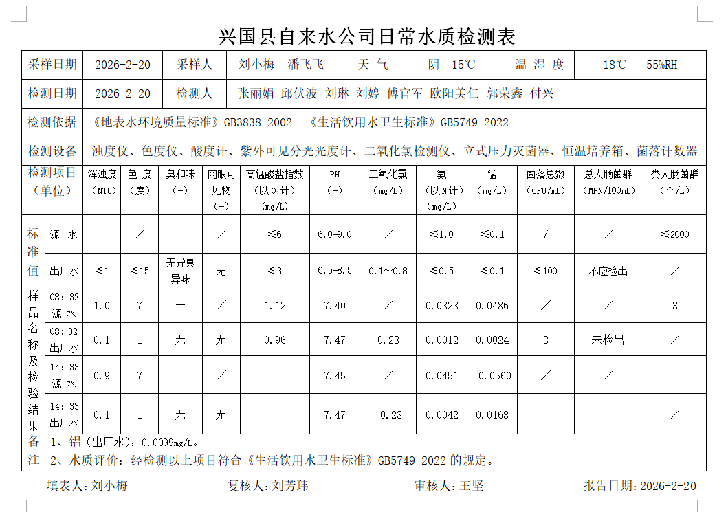 水質(zhì)常規(guī)檢測臺(tái)賬(2026年2月20日)