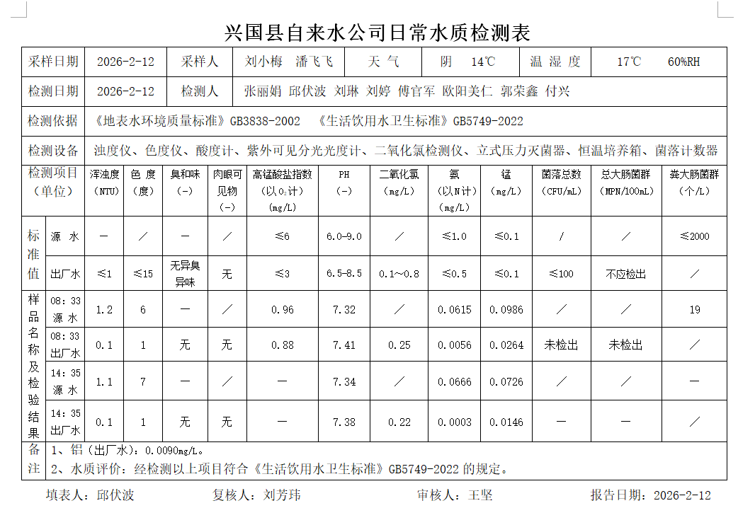 水質(zhì)常規(guī)檢測(cè)臺(tái)賬(2026年2月12日)