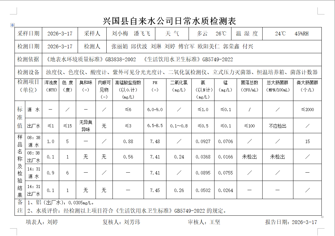 水質(zhì)常規(guī)檢測臺賬(2026年3月17日)