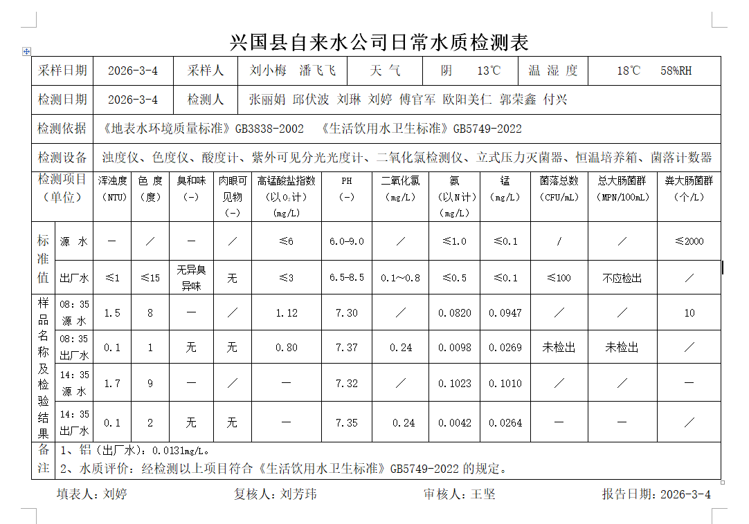 水質常規檢測臺賬(2026年3月4日)