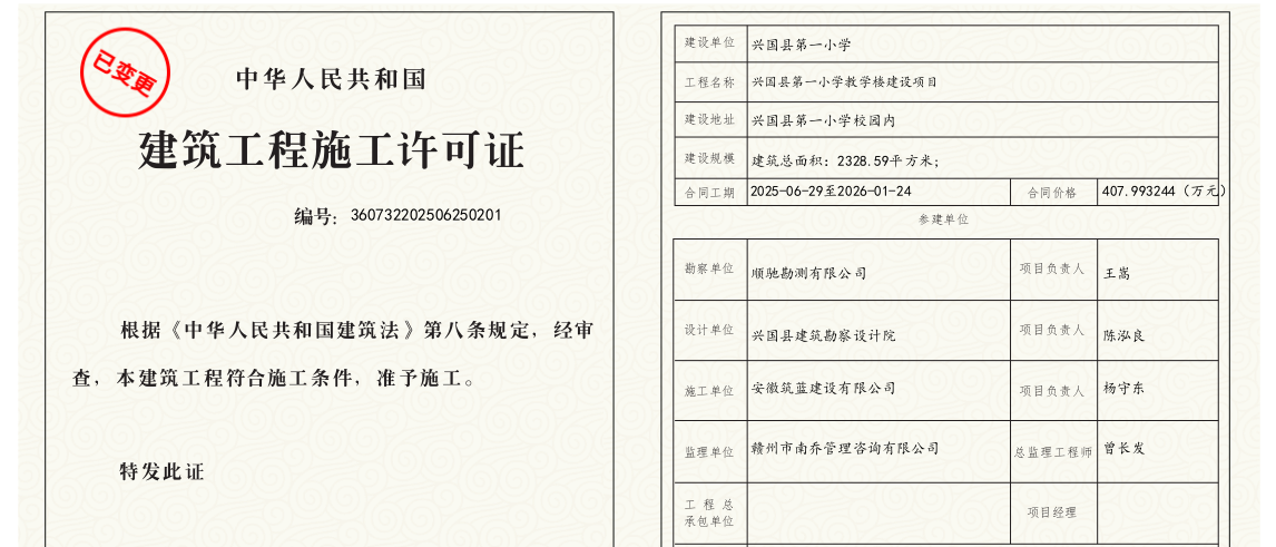 興行審?fù)顿Y字〔2025〕781號興國縣第一小學(xué)教學(xué)樓建設(shè)項目建筑工程施工許可證(變更)