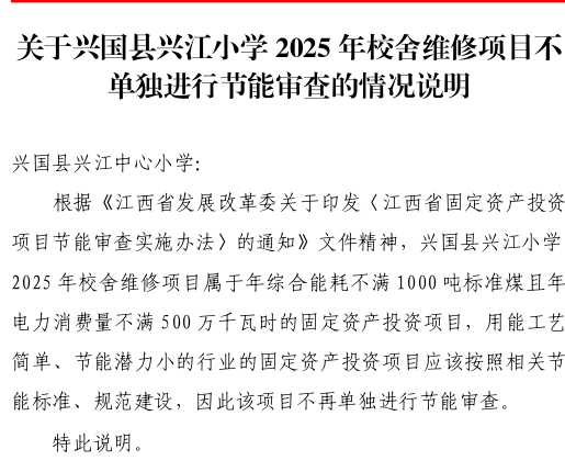 興行審?fù)顿Y字〔2025〕746號興國縣興江小學(xué)2025年校舍維修項目不單獨進行節(jié)能審查的情況說明