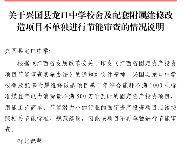 興行審?fù)顿Y字〔2025〕712號興國縣龍口中學(xué)校舍及配套附屬維修改造項目不單獨進行節(jié)能審查的情況說明的批復(fù)