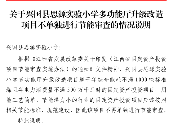 興行審投資字〔2025〕771 號興國縣思源實驗小學多功能廳升級改造項目不單獨進行節能審查的情況說明的批復