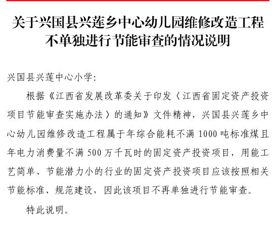 興行審?fù)顿Y字〔2025〕723號興國縣興蓮鄉(xiāng)中心幼兒園維修改造工程不單獨(dú)進(jìn)行節(jié)能審查的情況說明