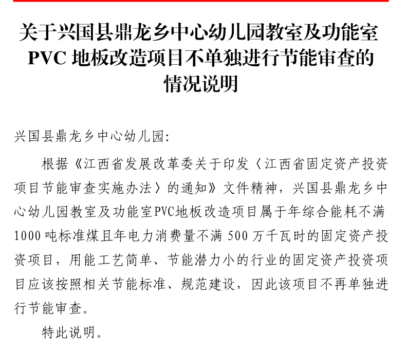 興行審?fù)顿Y字〔2025〕744 號(hào)興國(guó)縣鼎龍鄉(xiāng)中心幼兒園教室及功能室PVC地板改造項(xiàng)目不單獨(dú)進(jìn)行節(jié)能審查的情況說(shuō)明的批復(fù)