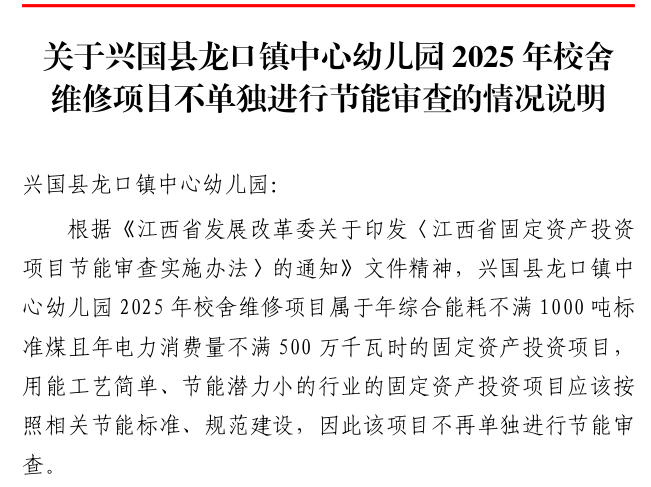 興行審投資字〔2025〕715 號興國縣龍口鎮中心幼兒園 2025 年校舍維修項目不單獨進行節能審查的情況說明的批復