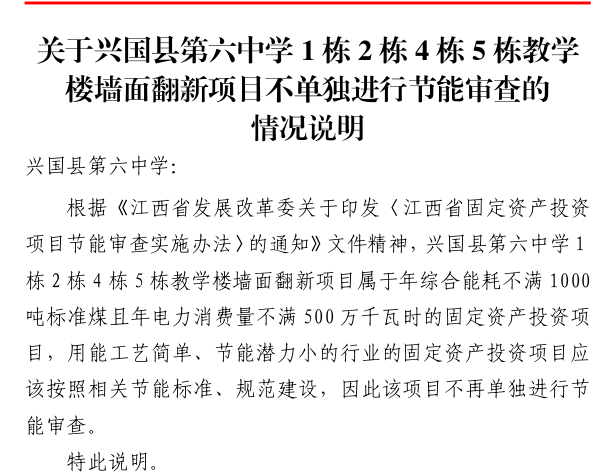 興行審投資字〔2025〕731 號興國縣第六中學 1 棟 2 棟 4 棟 5 棟教學樓墻面翻新項目不單獨進行節能審查的情況說明的批復