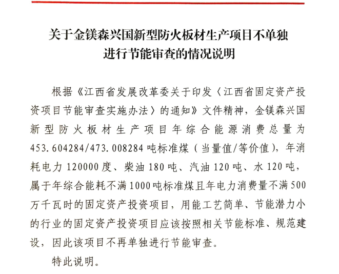 興行審投資字〔2025〕1015號關于金鎂森興國新型防火板材生產項目不單獨進行節能審查的情況說明