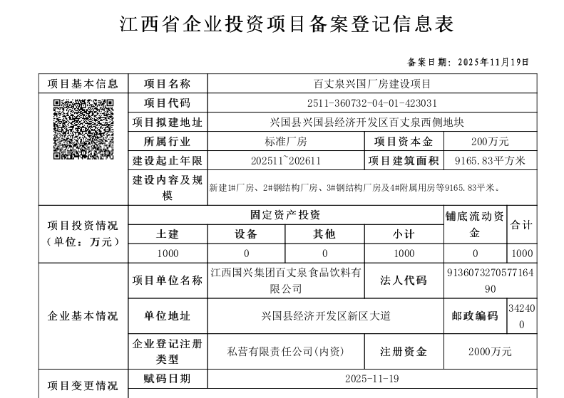 興行審?fù)顿Y字〔2025〕1022號(hào)百丈泉興國廠房建設(shè)項(xiàng)目備案通知書