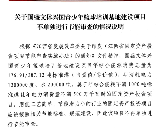 興行審投資字〔2025〕972號關于國盛文體興國青少年籃球培訓基地建設項目不單獨進行節能審查的情況說明