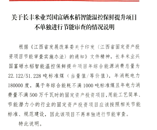興行審?fù)顿Y字〔2025〕994號關(guān)于長豐米業(yè)興國富硒水稻智能溫控保鮮提升項目不單獨進(jìn)行節(jié)能審查的情況說明
