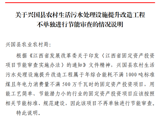 興行審投資字〔2025〕1030號關于興國縣農村生活污水處理設施提升改造工程不單獨進行節能審查的情況說明