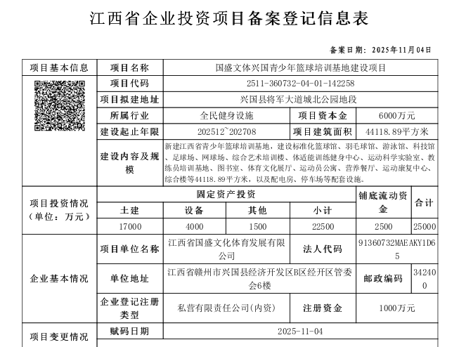 興行審?fù)顿Y字〔2025〕973號(hào)國(guó)盛文體興國(guó)青少年籃球培訓(xùn)基地建設(shè)項(xiàng)目備案通知書
