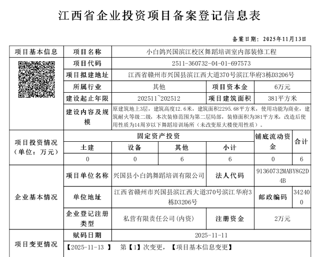 興行審?fù)顿Y字〔2025〕1002號(hào)小白鴿興國(guó)濱江校區(qū)舞蹈培訓(xùn)室內(nèi)部裝修工程備案通知書(shū)