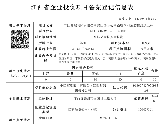 興行審投資字〔2025〕977號中國郵政集團有限公司興國縣分公司南坑營業所裝修改造工程備案通知書