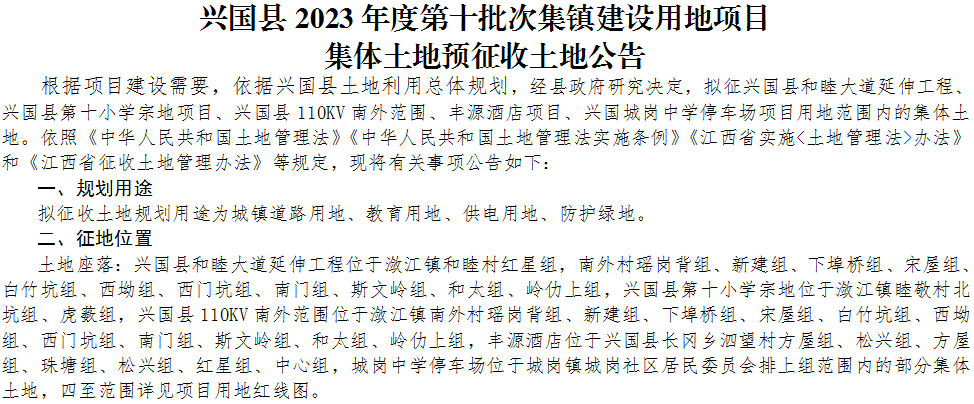 興國縣2023年度第十批次集鎮建設用地項目集體土地預征收土地公告