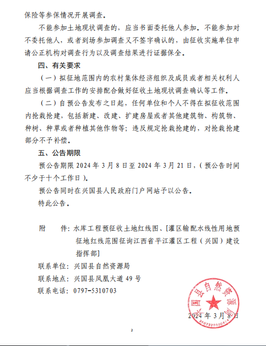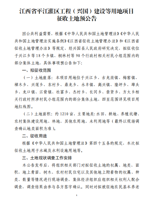 江西省平江灌區(qū)工程(興國)建設(shè)等用地項目征收土地預(yù)公告