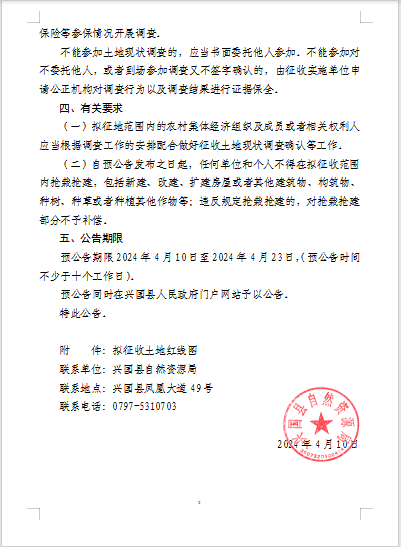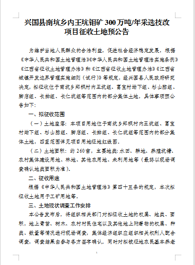 興國縣南坑鄉鉬礦300萬噸/年采選技改項目征收土地公告