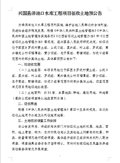 興國縣洋池口水庫工程項目征收土地預公告
