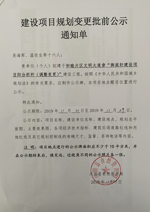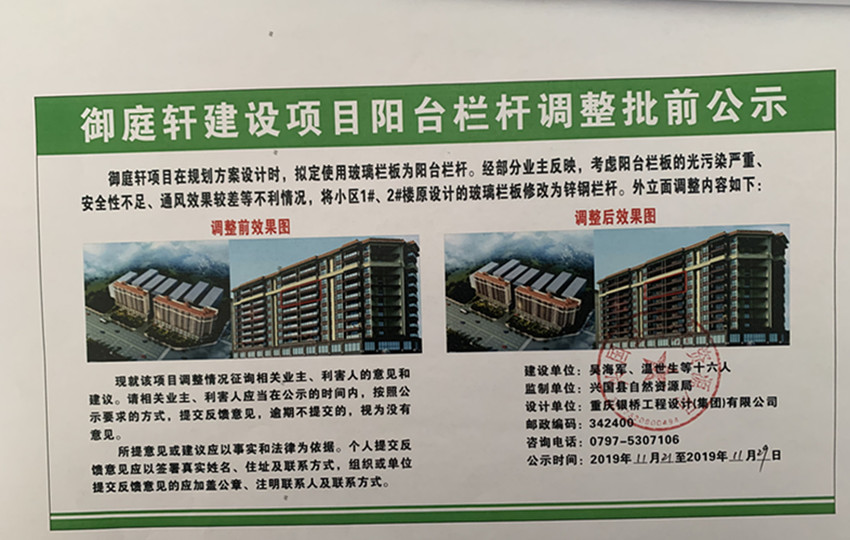 和睦片區文明大道旁“御庭軒建設項目陽臺欄桿(調整變更)”建設工程變更批前公示