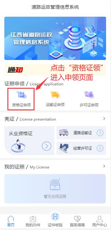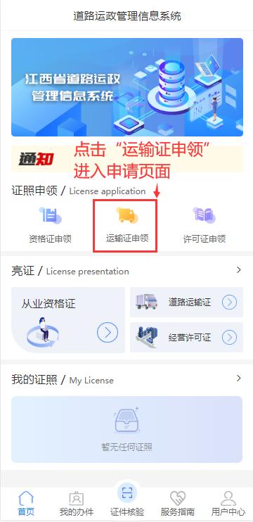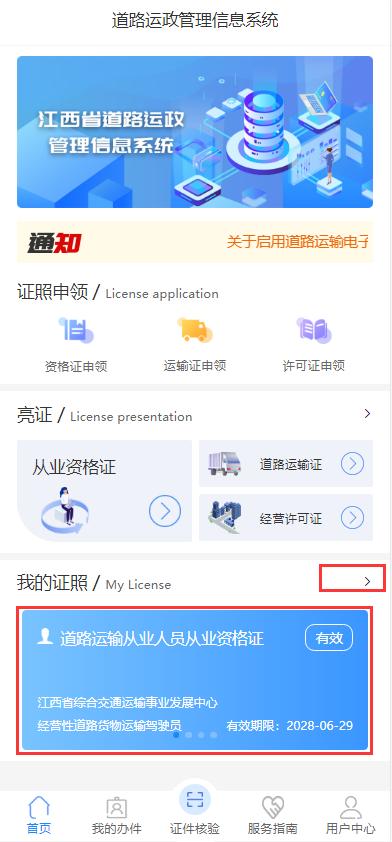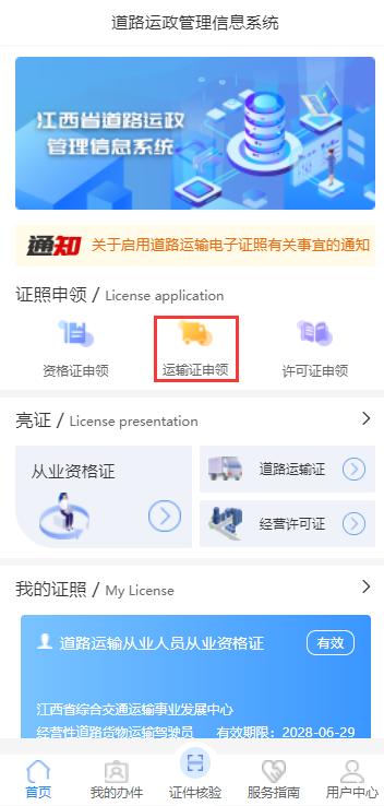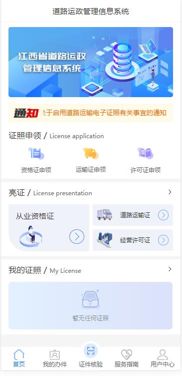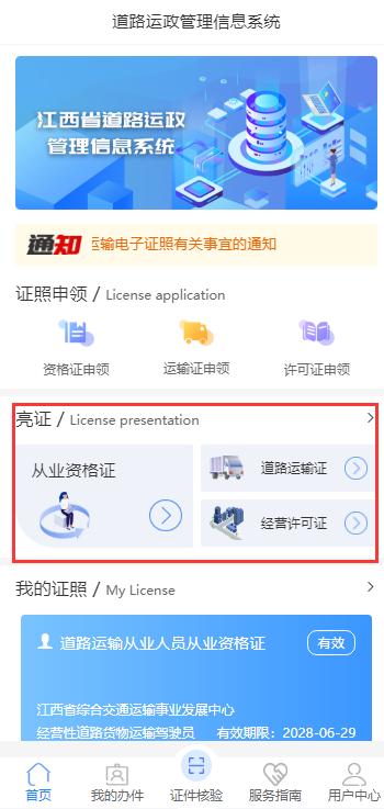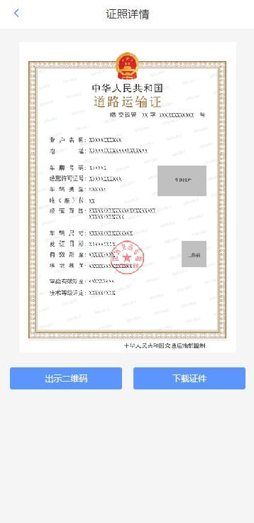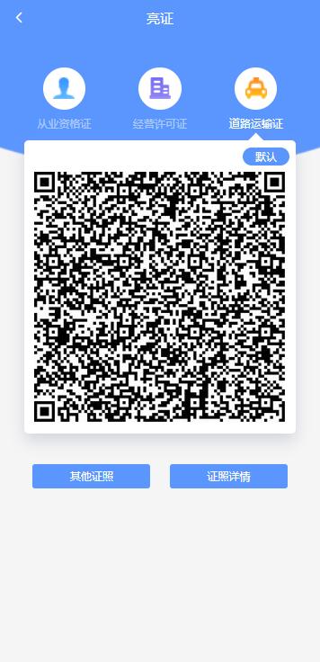用戶在申領證照完結之后可直接點擊首頁“亮證”下的“從業資格證、道路運輸證、經營許可證”直接亮出默認的證照二維碼供執法人員進行掃描核驗證照信息。