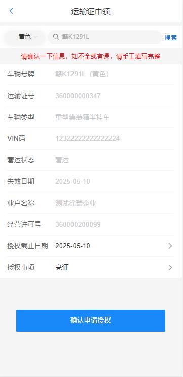 駕駛員點擊“首頁-運輸證申領”進入申請頁面,輸入車牌號牌進行車輛信息驗證,驗證通過之后點擊“確認申請授權”提交至車輛所有人進行審核。
