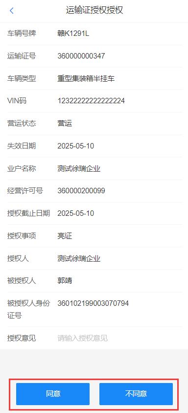 車輛所有人在“我的辦件-辦理中”進行確認,點擊“授權”按鈕進入“運輸證授權”頁面,核對被授權人信息點擊“同意”或者“不同意”,同意之后駕駛員可以在系統中查看并對該車輛亮證。